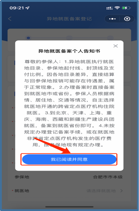 第二步:界面弹出的《异地就医备案个人告知书》,请认真阅读后,点击【我已阅读并同意】,进入下一界面。