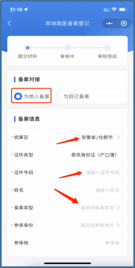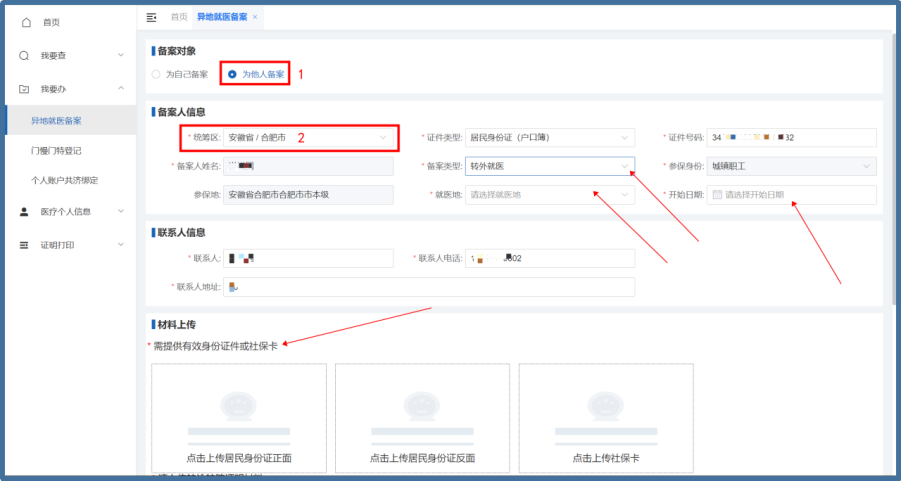 在界面上勾选【为他人备案】,选择“他人”就医人所在的【统筹区】、【证件类型】,输入就医人的证件号码,系统自动查询就医人的参保信息,选择备案类型、就医地、开始日期,填写联系人电话、联系人地址等信息,按界面显示所需的材料清单,上传电子材料(手机等拍照jpg格式即可),填写完成并核对无误后,点击【提交】,完成备案。